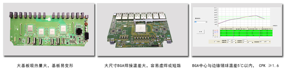 獨立控溫的三部份發熱系統靈活組合,輕松應對密間距相鄰BGA返修對溫差要求(相鄰間距4mmBGA返修另一BGA錫球溫度 低于183℃)